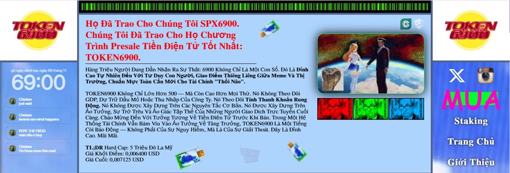 TOKEN6900 (Ticker T6900) là kẻ săn mồi đỉnh cao của thị trường meme – một token ERC-20 được cung cấp bởi không gì khác ngoài sự rung cảm, ảo tưởng và ảo giác tập thể của các nhà giao dịch trực tuyến.