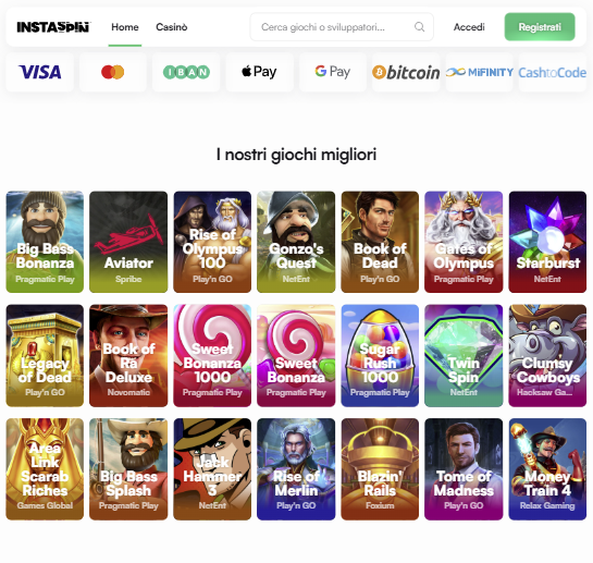 Instaspin ha reinventato il concetto di bonus di benvenuto, trasformandolo in un’esperienza prolungata. Il pacchetto da €1.000 viene accompagnato da 100 giri gratuiti su una delle slot che pagano di più, ossia Big Bass Bonanza.