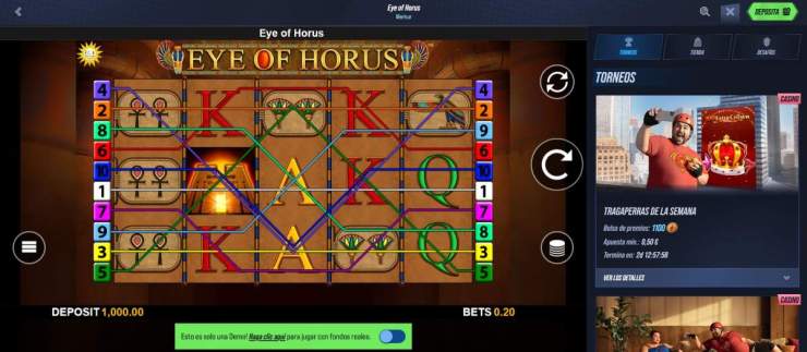 De hecho, en los mejores casinos online de España encontrarás Eye of Horus disponible en cualquier momento del día. Puedes jugar gratis o con dinero real, tú decides. Los sitios ofrecen una pequeña guía para principiantes al abrir el juego, ideal si es tu primera vez con esta slot. Además, incluso en conexiones más lentas, el juego se ejecuta sin problemas. El único punto mejorable es la herramienta de búsqueda, que puede no mostrar todos los resultados si no introduces el nombre exacto.