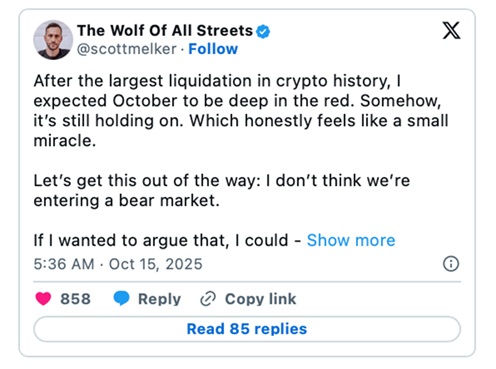 不過,並非所有人都認為這代表市場疲軟。加密播客主持人 Scott Melker 表示,這次回檔「純粹是結構性調整」,並堅稱市場仍處於看漲階段——交易員們稱之為「Uptober」(上漲的十月)。