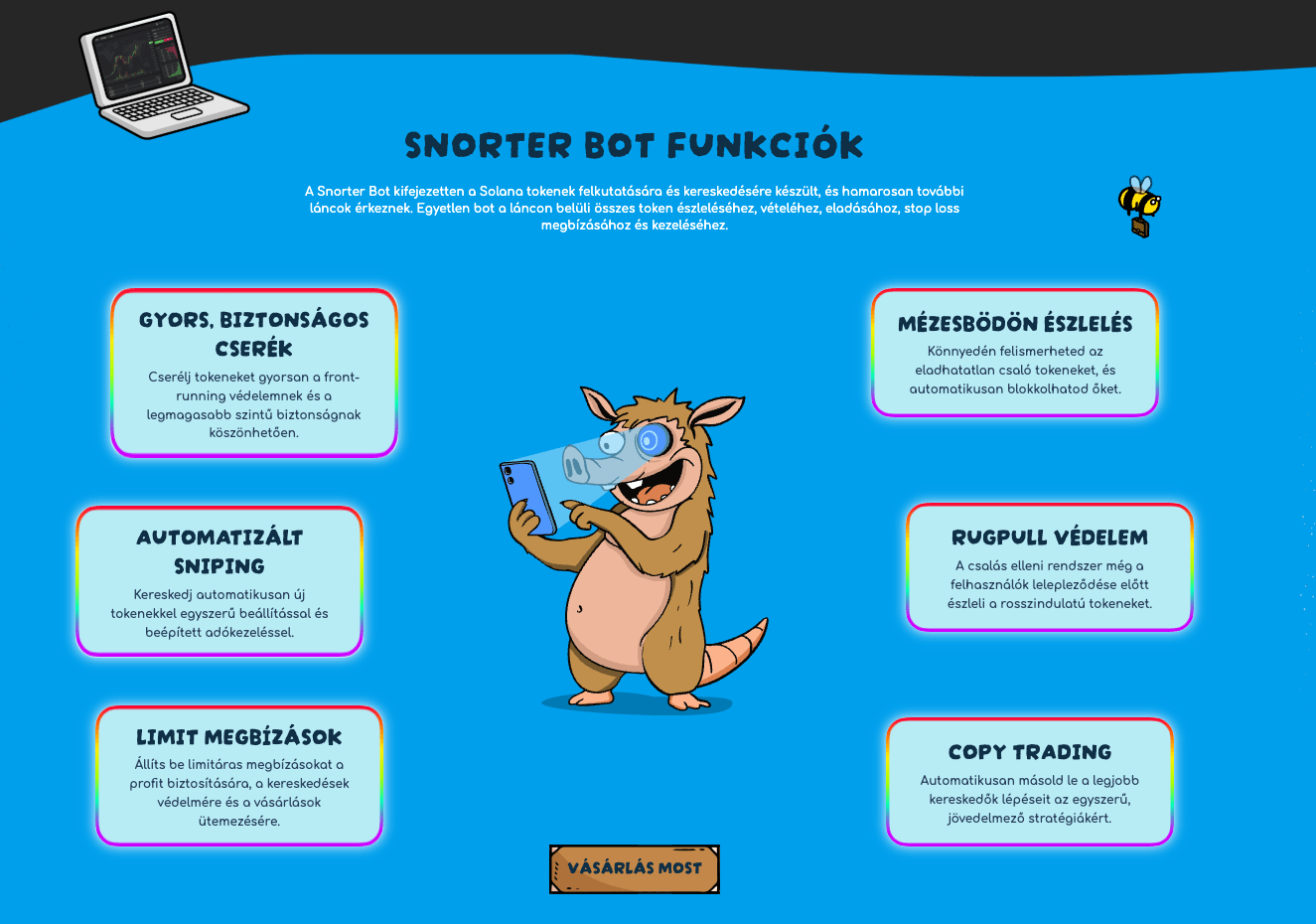 A Snorter token, vagyis a $SNORT, a Snorter Bot működését segítő natív kriptovaluta. Ez a Telegramon futó bot segít a mém coinok azonosításában és kezelésében Solana hálózaton, de a jövőben támogatja majd az Ethereumot, a BNB-t, a Polygon-t és a Base láncokat is. Ez különösen hasznos, hiszen a mém coin vadászat kézzel igazán fárasztó és időigényes lehet.