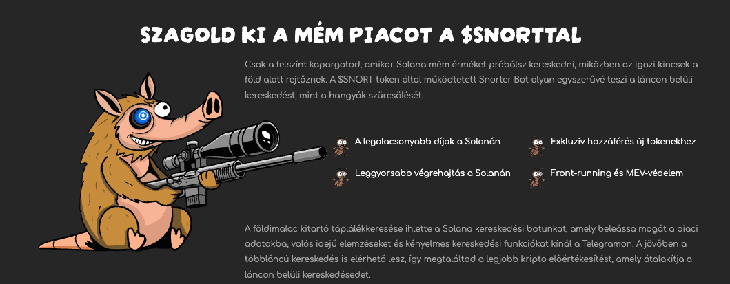 A $SNORT a Snorter Telegram kereskedési bot saját tokenje, amely megkönnyíti a mém coinok adásvételét. Egyszerűen lehet benne stop-loss és limit megbízásokat beállítani, valamint automatikusan lecsapni frissen listázott coinokra. Emellett megvéd az olyan csalásoktól, mint a sandwich támadások, rug pull-ok vagy honeypotok, és még a copy trading funkció is be van építve.
