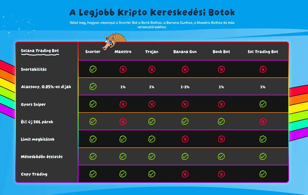Jelen állás szerint igen. A Banana Gun például nem kínál limit megbízást és másolható kereskedést, míg a Snorter bot ezeket is tudja. Ráadásul a $SNORT birtoklása csak 0,85%-os kereskedési díjat jelent, míg a Unibot legalább 1%-ot számol fel – ez hosszú távon nagy különbség.