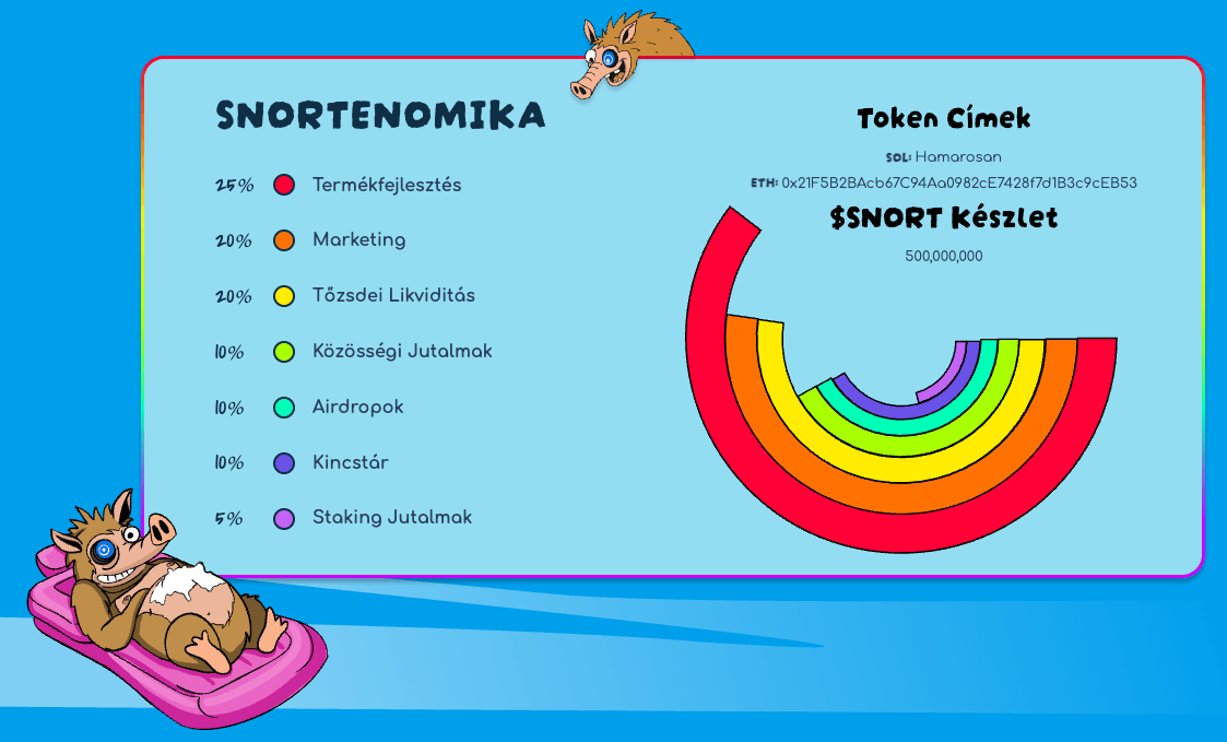- Token elosztás: A teljes kínálat 500 millió $SNORT. Ebből 25% fejlesztésre (125M), 20% marketingre (100M), 20% tőzsdei likviditásra (100M), 10% közösségi jutalmakra (50M), 10% airdropokra (50M), 10% tartalékba (50M), 5% pedig stakingre (25M) van félretéve.