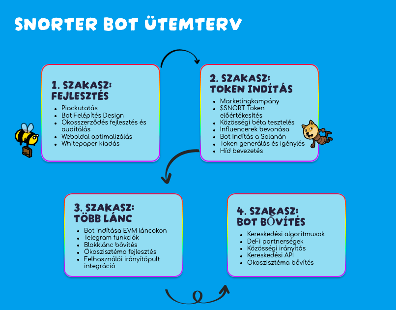 - Fejlesztési ütemterv: whitepaper és termékfejlesztés → előértékesítés, béta teszt és tokenindítás → ökoszisztéma bővítés → új botfunkciók, DeFi partnerségek, közösségi irányítás és kereskedési API integráció.