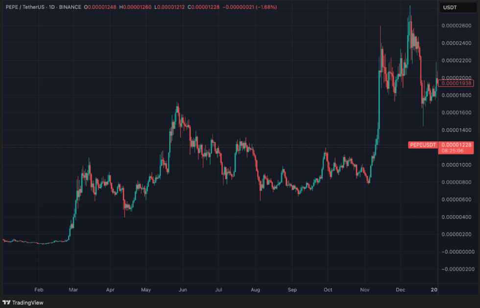 През 2024 г., ако сте закупили $PEPE на цена около $0.00000130 в началото на годината и сте го задържали до края, токенът е достигнал $0.00002836 – това е ръст от 21.8 пъти.