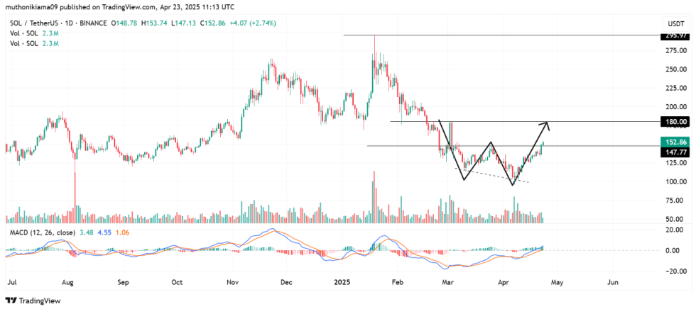 Dal punto di vista tecnico, Solana ha confermato un pattern a doppio minimo sul grafico giornaliero, superando la resistenza a 147 dollari.