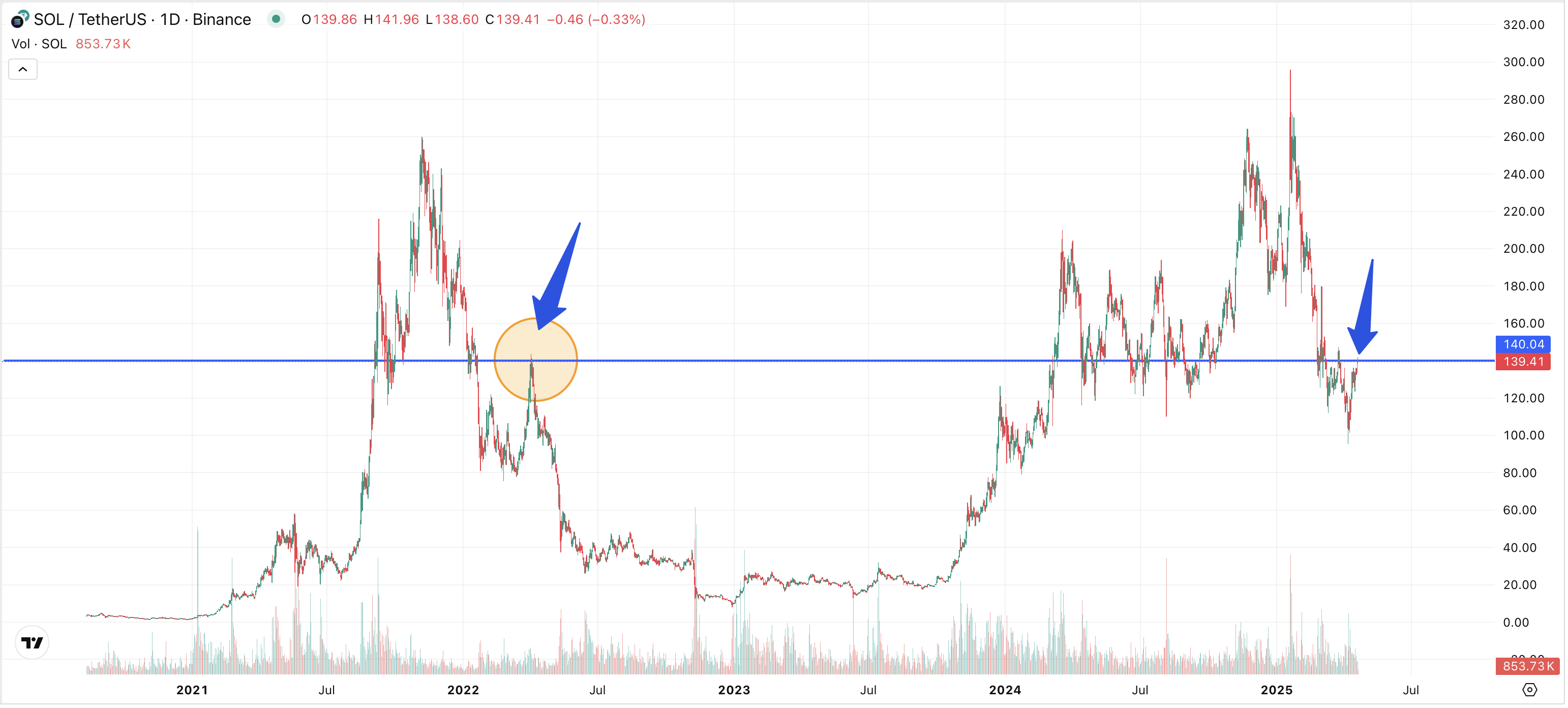 Solana gehört zu den volatilsten Coins unter den großen Kryptowährungen. Kaum ein anderer Coin hat in den letzten Jahren für so viel Aufsehen gesorgt, sowohl durch massive Kursgewinne als auch durch heftige Einbrüche. Anfang 2021 konnte sich der Kurs innerhalb weniger Monate vervielfachen, bevor ein tiefer Crash folgte. Im Frühjahr 2022 dann die nächste Hoffnung. $SOL hat sich damals vom Crash um 80 % erholt und ist dann der an exakt derselben Marke gescheitert, an der sich der Kurs heute bewegt.