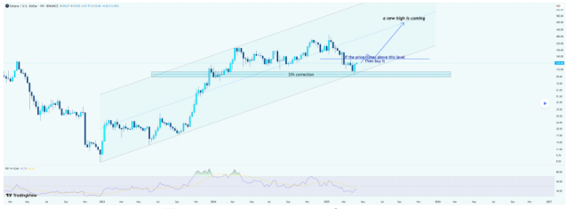 De RSI-indicator toont ook herstel vanuit de lagere regionen. Dit wijst op opbouw van koopkracht binnen de huidige structuur. Bij een doorbraak van de resistance ligt een prijs boven $250 binnen bereik. Wordt het kanaal volledig benut, dan is zelfs een stijging richting $300+ mogelijk.