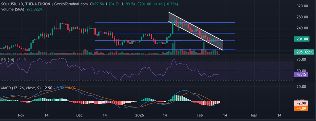 GeckoTerminalによると、Solanaは下降チャネルを上抜けようとしている。仮想通貨が下限を突破すれば、223.34を目指すかもしれない。