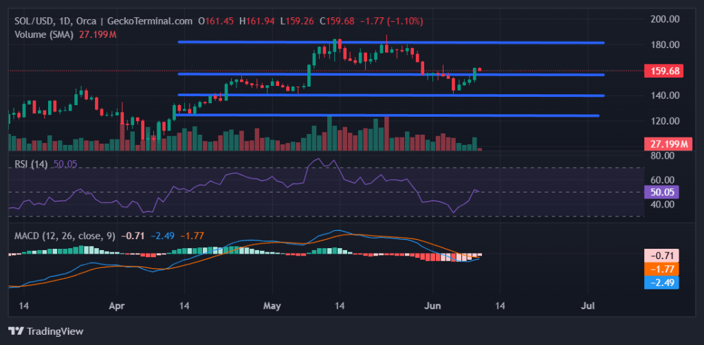 Solanaの価格は、2025年6月10日22時14分(米東部標準時)時点で159.28ドル(約24,900円)となり、過去24時間で5%上昇した。投資家がこのアルトコインへのエクスポージャーを増やす中で、週次パフォーマンスも再びプラス圏に戻っている。