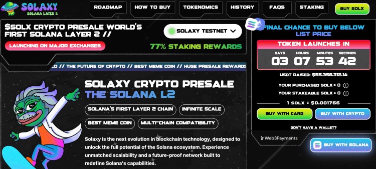 Viena no galvenajām $SOL tokena bullish jeb pozitīvā noskaņojuma saglabāšanās iemesliem ir tā dinamiskā ekosistēma, kurā ietilpst gan mēmu žetoni, gan nopietnāki altkoini. Viens no interesantākajiem jaunumiem šajā ekosistēmā ir Solaxy (SOLX) – otrā slāņa (Layer 2) tīkls, kas nesen noslēdza iepriekšpārdošanu, piesaistot iespaidīgus 55,3 miljonus dolāru.