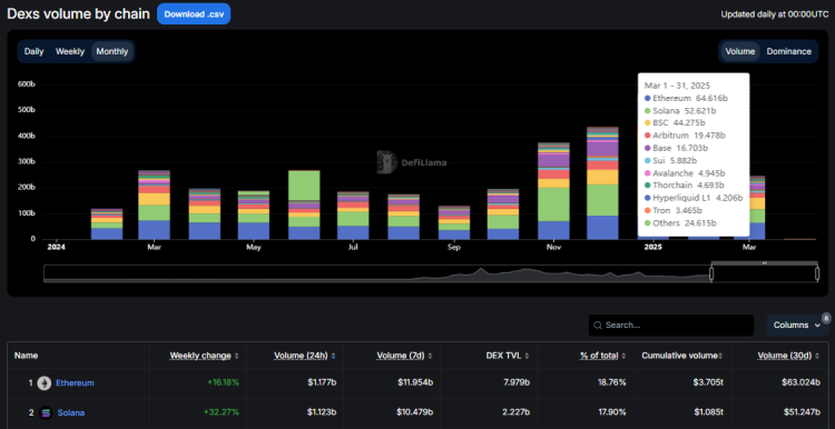 De gegevens van DeFiLlama liegen er niet om. In maart 2025 registreerden de op Ethereum gebaseerde DEX’s in totaal een trading volume van $64,6 miljard. In dezelfde periode zette het Solana netwerk een DEX volume van $52.6 miljard neer.