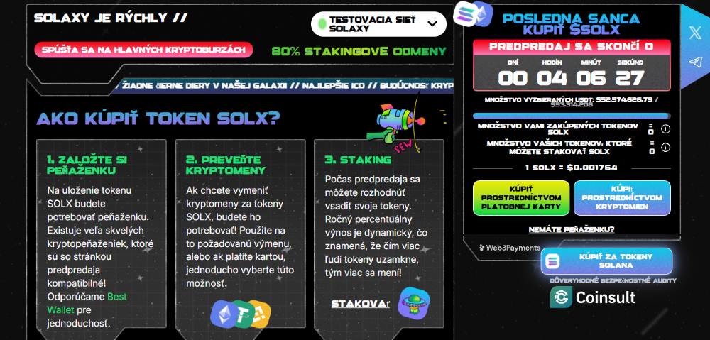 Predpredaj Solaxy ($SOLX) sa nepochybne zapíše medzi najúspešnejšie v roku 2025. So získanými 52 miliónmi dolárov a ambíciou stať sa kľúčovou infraštruktúrou pre ekosystém Solana projekt demonštruje svoj obrovský potenciál. Ak ste zvažovali investíciu, teraz je ten správny čas konať.