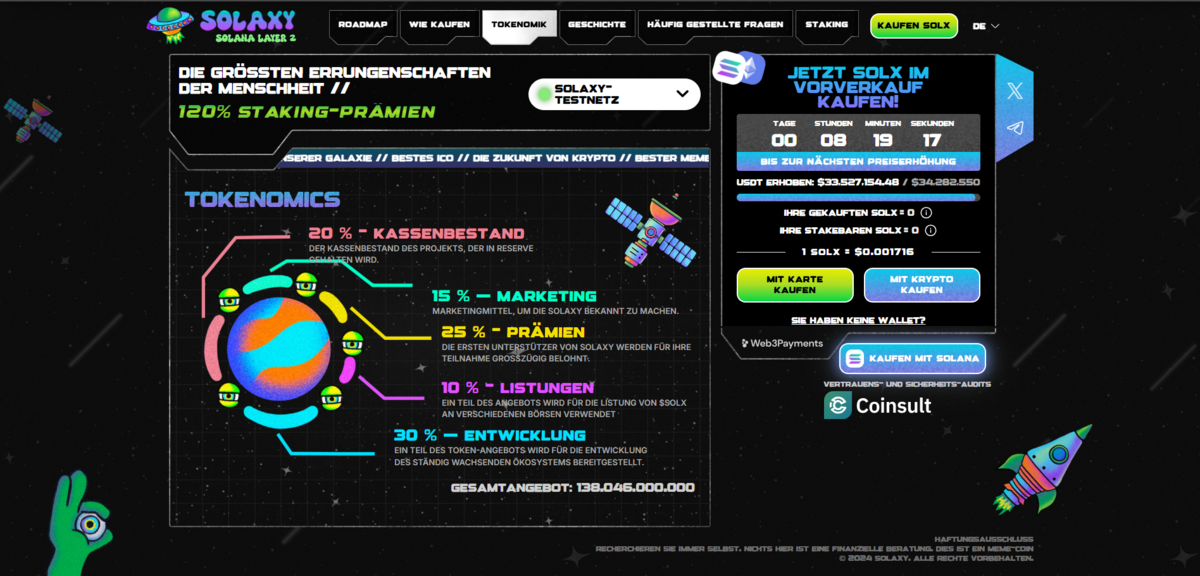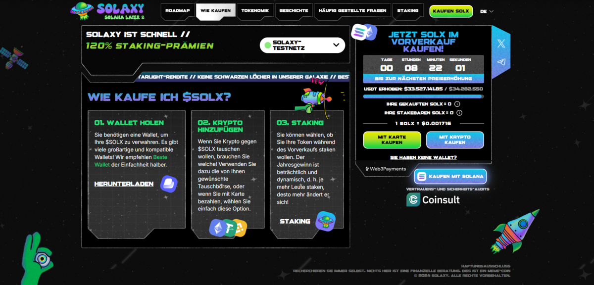 Der Kauf ist über Partner wie Bitcoinist möglich. Von hier aus wird man direkt zum offiziellen Presale geleitet und kann den $SOLX Token kaufen.