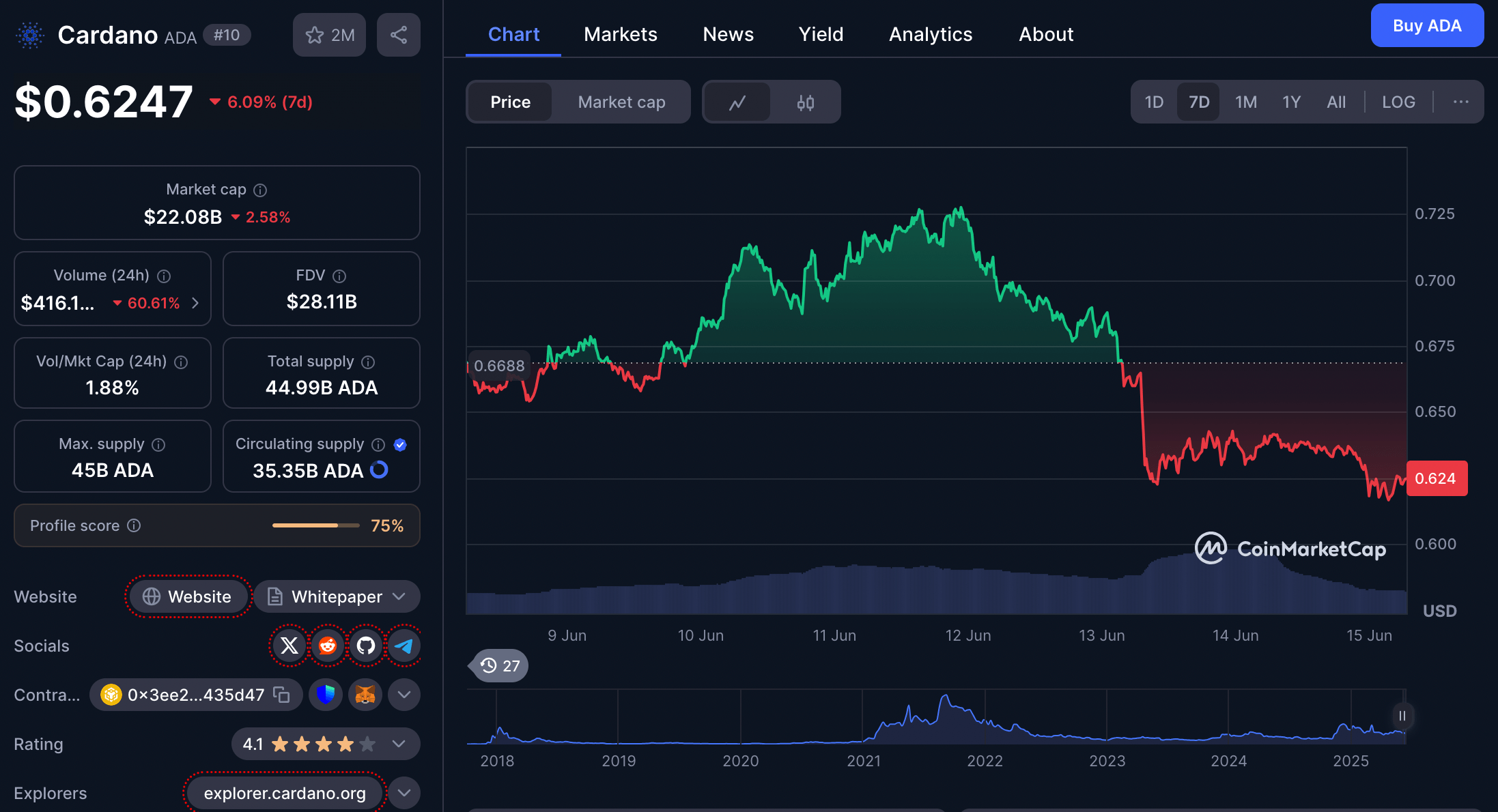 Cardano (ADA) juga mengalami tekanan harga seperti mayoritas altcoin utama lainnya. Selama sepekan terakhir, harga ADA turun sekitar 6,15% dan kini berada di kisaran $0,62 atau Rp10.437.