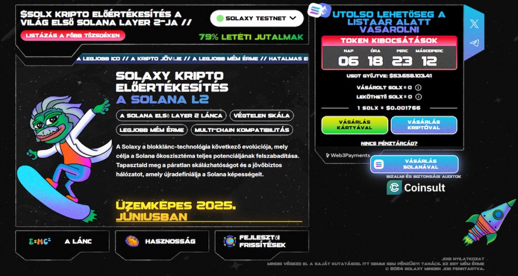 A kriptopiac figyelme középpontjába került a Solaxy projekt, amely a Solana hálózatra fejlesztett Layer-2 megoldásként robbant be a köztudatba. A projekt lenyűgöző, 52 millió dolláros tőkét gyűjtött össze a globális befektetői közösségtől, ezzel messze túlteljesítve az előzetes várakozásokat. Az idő azonban vészesen fogy: kevesebb mint egy nap áll rendelkezésre, hogy a befektetők kihasználják ezt a kivételes lehetőséget.