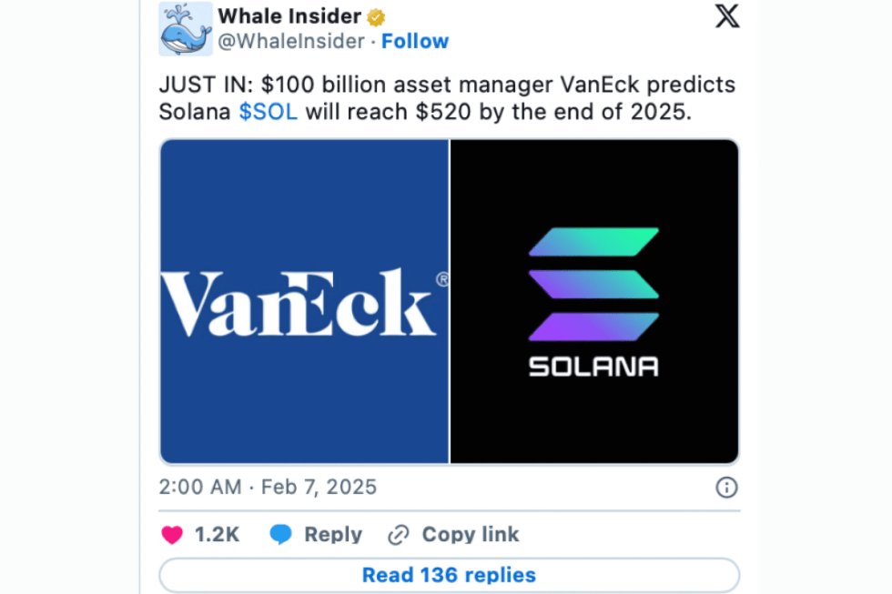 Ο επενδυτικός κολοσσός VanEck, με υπό διαχείριση κεφάλαια άνω των $116 δισ., έχει προβλέψει ότι το $SOL μπορεί να φτάσει τα $520 μέσα στο 2025.