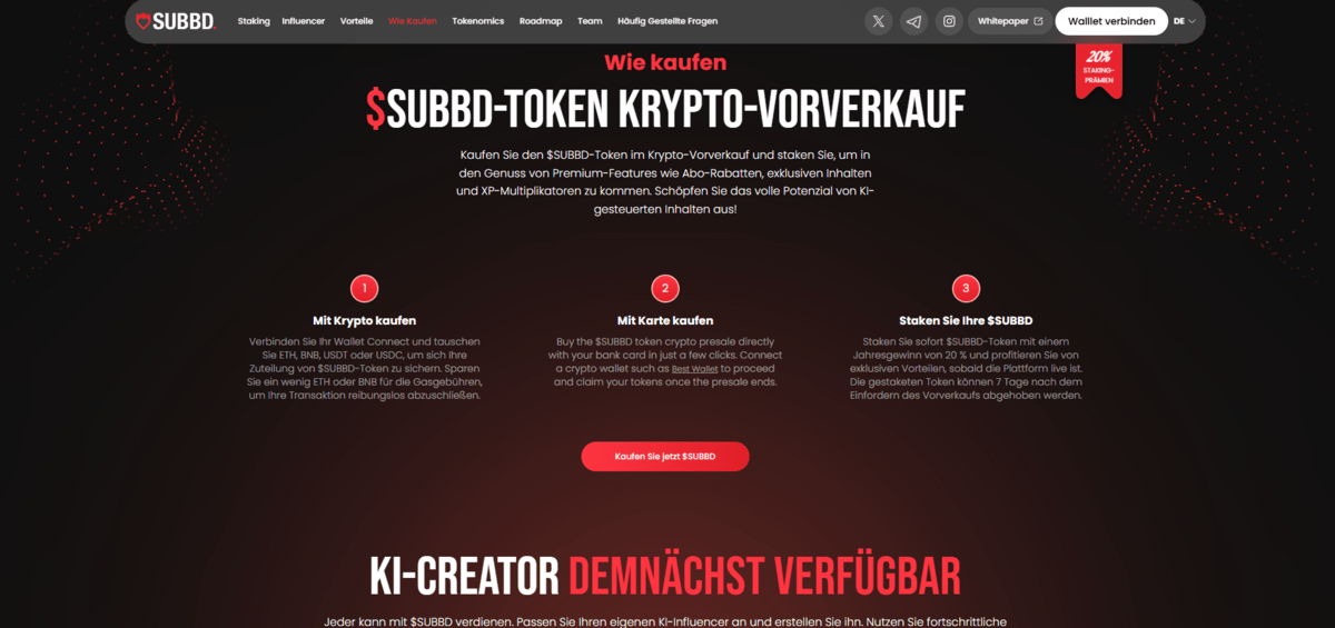 - Staking-Rewards: Neben der Nutzung auf der Plattform können $SUBBD Token gestaket werden. Nutzer erhalten dabei bis zu 20 % jährliche Rendite, was einen attraktiven Anreiz für langfristiges Engagement bietet.