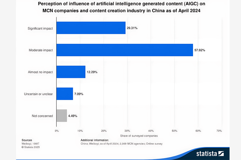 Η AI δημιουργία περιεχομένου (AIGC) εξελίσσεται ραγδαία. Σύμφωνα με τη Statista, το 87% των Multi-Channel Networks θεωρούν ότι το AI θα έχει τουλάχιστον μέτρια επίδραση στη βιομηχανία – και σχεδόν 30% βλέπουν το AI ως βασικό μοχλό των εξελίξεων.