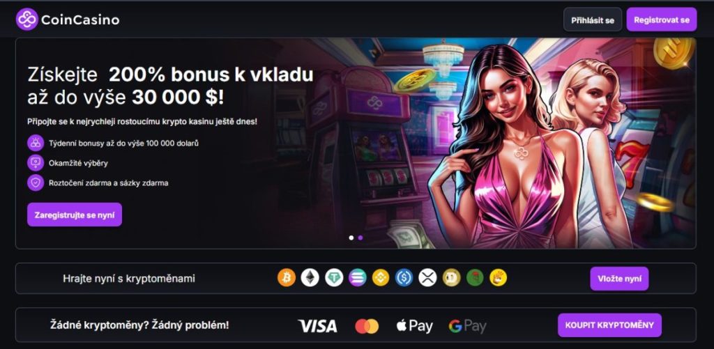 - CoinCasino láká kryptonadšence na unikátní bonusy pro držitele BTC, ETH a USDT, které jsou často vázané na exkluzivní Telegram výzvy a odměny za aktivitu v chatu.