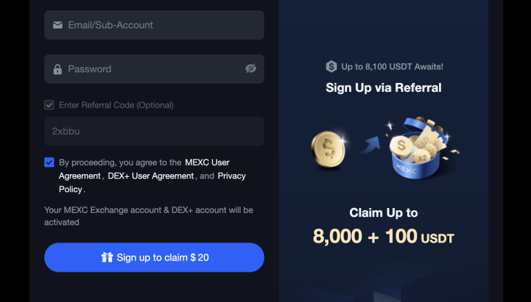 Obiščite uradno spletno stran MEXC in kliknite gumb »Sign up«. Uporabite lahko e-poštni naslov ali telefonsko številko. Po vnosu podatkov boste prejeli potrditveno kodo, ki jo vpišete v obrazec.
