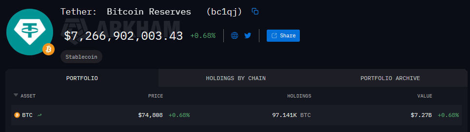 Arkham Intelligence data placed the value of the transfer at a little over $70 million. The stablecoin issuer’s reserve address now holds 91,141 BTC, a stack that puts it in fifth place among on-chain Bitcoin holders.