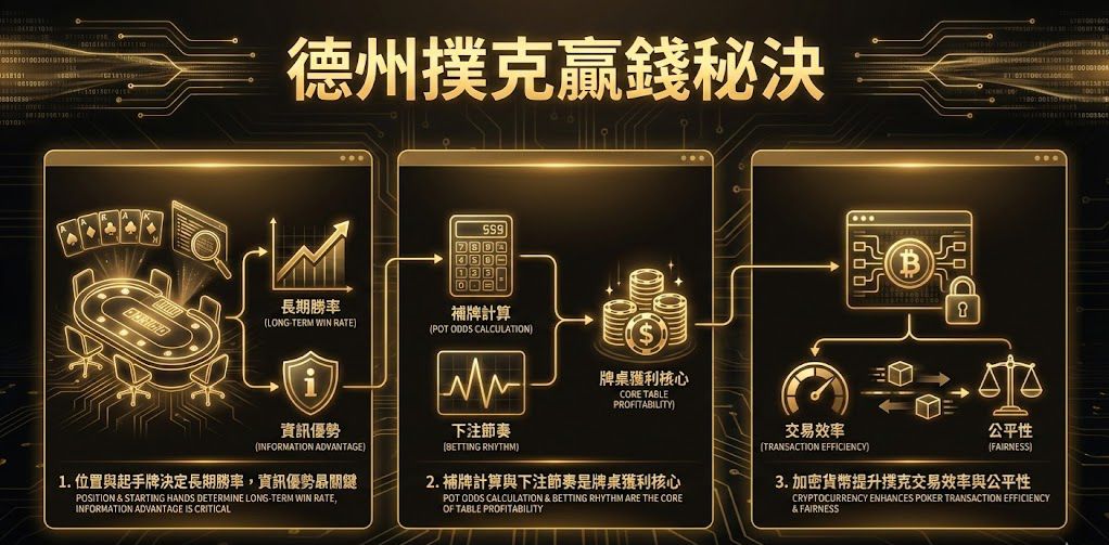 德州撲克的長期勝利來自五大核心:規則理解、位置判斷、起手牌選擇、機率計算與心理決策。這些元素共同塑造職業玩家能於長期對局中保持盈利的根基。而加密貨幣的普及則推動線上撲克邁向透明化與全球化,創造前所未有的自由流動性與公平度。
