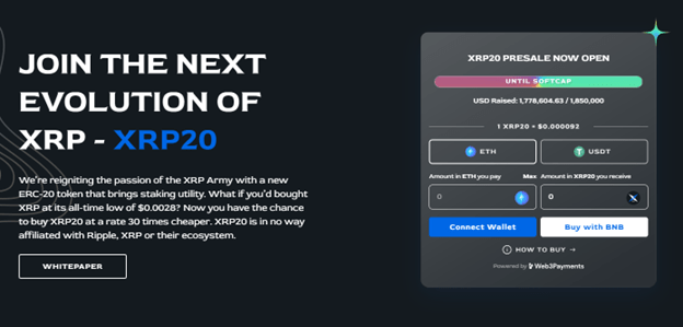 XRP20 is now valued at $0.000092 during the presale period for the token. With a presale minimum soft cap of $1,850,000, the project’s target funding amount is $3,680,000. With reference to XRP’s past performance, there is a large chance that this investment will turn a profit. The effort has already collected more than $1.9 million in funding.