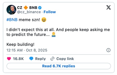 CZ 的預言似乎正在成真——「幣安季」正式開啟!與此主題相關的代幣 BNB SZN 目前穩居熱度榜首,過去一夜暴漲 2,900%,成為本輪幣安鏈迷因行情中最火爆的明星幣。