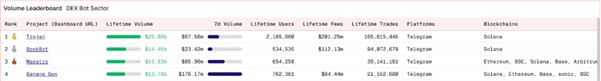 不過,市場上也存在激烈競爭。Banana Gun、Maestro 和 Trojan 目前在這一領域佔據主導地位,三者在過去七天內的總交易量已達到 3.1969 億美元,展現出強勁的市場控制力。