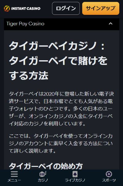 タイガーペイ対応オンラインカジノであるインスタントカジノを詳しく解説していきます。