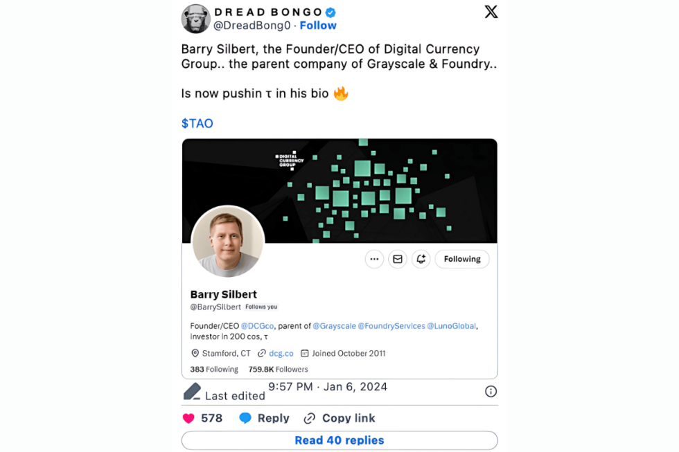 - Νοέμβριος 2024: Ο Barry Silbert (DCG) επενδύει $100 εκατ. σε Bittensor ($TAO) και ιδρύει τη Yuma – AI πλατφόρμα για devs στο Bittensor.