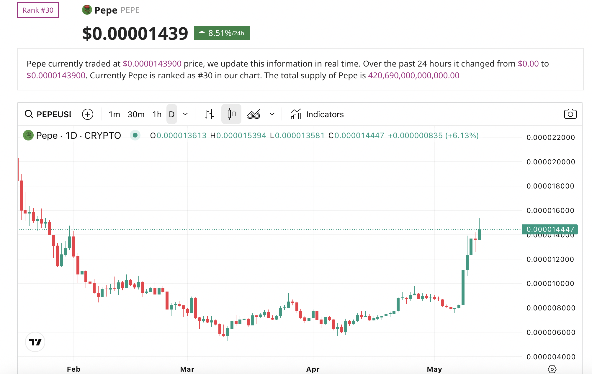 Saat ini Pepe Coin (PEPE) diperdagangkan pada harga $0.00001453, dengan nilai kapitalisasi pasar sebesar $6,11 miliar. Volume transaksi harian sangat tinggi, menyentuh angka $2,79 miliar. Dari total suplai 420,69 triliun token, sebanyak 420,68 triliun telah beredar, mencakup 99,9999 persen dari total pasokan.