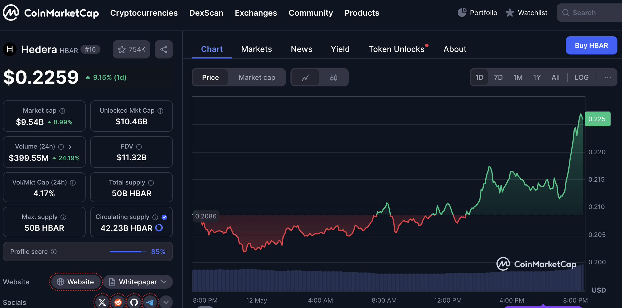 Token HBAR dari Hedera saat ini diperdagangkan di level $0,2137 dan menempati urutan ke-17 dalam peringkat kapitalisasi pasar kripto. Proyek ini mencatat total kapitalisasi senilai $9,02 miliar, dengan volume perdagangan harian mencapai $317 juta. Dari total suplai maksimum sebesar 50 miliar token, sekitar 42,23 miliar telah didistribusikan ke pasar.