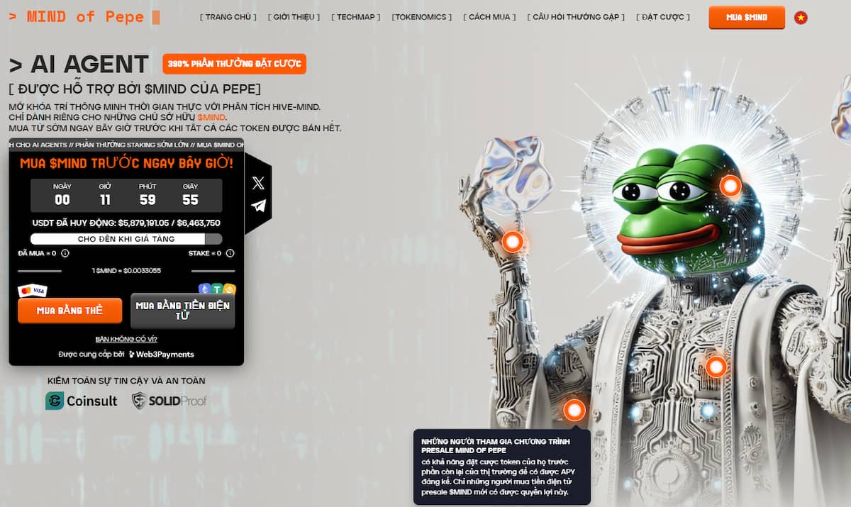 MIND of Pepe ($MIND) là một dự án kết hợp công nghệ blockchain tiên tiến với trí tuệ nhân tạo (AI agent coin), giúp nâng cao trải nghiệm giao dịch cho nhà đầu tư. Token gốc của dự án, $MIND, mang lại quyền truy cập vào những phân tích chuyên sâu về biến động thị trường tiền điện tử, giúp người nắm giữ có lợi thế cạnh tranh cao hơn so với các dự án meme coin thông thường.