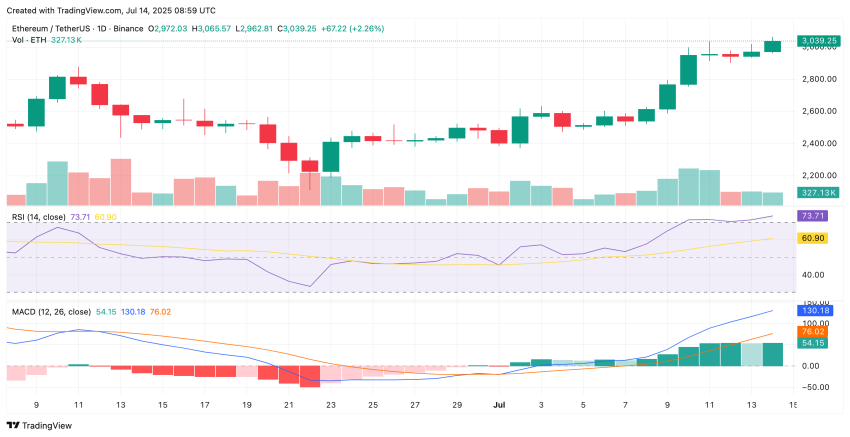 Ook de RSI bij Ethereum toont aan dat de kopers de overhand hebben. Een RSI boven de 70 toont een sterke koopkracht aan, maar kan tegelijkertijd wijzen op een mogelijke correctie. Naast de RSI laat ook de MACD-indicator een duidelijk bullish signaal zien.