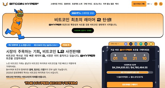 비트코인 하이퍼는 현재 프리세일 중이며 모금액은 이미 430만 달러를 넘어섰다. 각 $HYPER 토큰은 현재 최저가로 진입할 수 있는 지점이라고 할 수 있는 단 0.012375달러이다.
