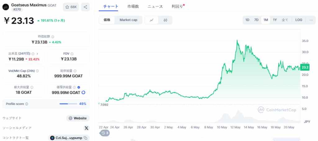 Goatseus Maximusは2024年11月に大きな話題を呼んだミームコインです。ピーク時には時価総額が約13億ドル(約2,028億円)に達しました。