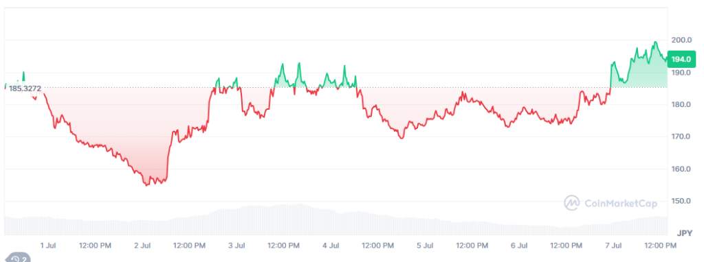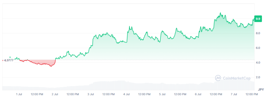 過去1週間で価格は100%上昇し、直近24時間でも7%上昇。現在の価格は約0.0603ドル(約9.1円)、時価総額は6,000万ドル(約90億円)と推定されている。