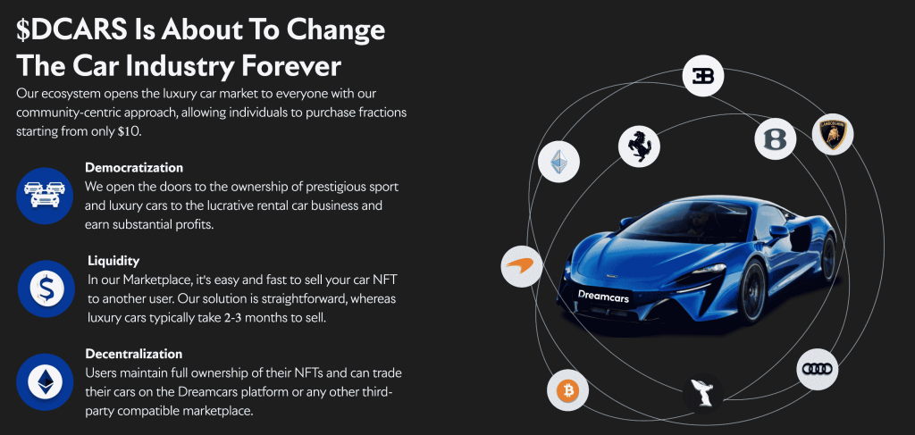 The Dreamcars ecosystem opens the luxury car market to everyone with a community-centric approach, allowing individuals to purchase fractions of high-end vehicles starting from only $10. This democratization of luxury car ownership is a key advantage of the platform.