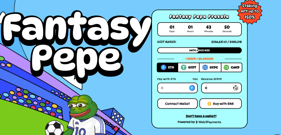 Fantasy Pepe предлага децентрализирана фантастична футболна лига, задвижвана от AI. Потребителите могат да правят прогнози за мачове, да събират NFT карти с играчи и да стейкват $FEPE токени за награди. Крипто предпродажбата започна на 21 април 2025 г., като началната цена е $0.000314 за токен. Структурата е на етапи: на всеки три дни цената се повишава, което стимулира ранно участие.