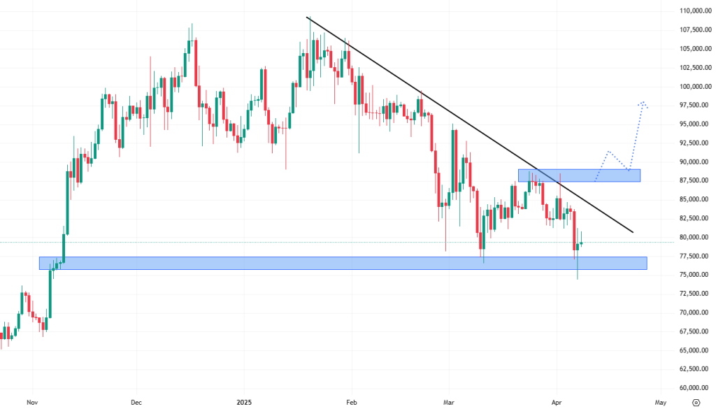 Bitcoin i nadále pokračuje ve svém sestupném trendu, který je zřetelný zejména na denním cenovém grafu. Cena respektuje klesající trendovou čáru, a i když došlo ke krátkému výkyvu pod klíčovou hranici supportu na 75 000 USD, bitcoin se rychle vrátil zpět nad tuto úroveň.