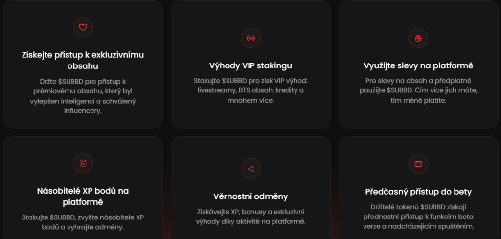 Pro fanoušky znamená SUBBD víc než jen sledování – je to aktivní účast. Stakování přináší denní bonusy, XP body i kredity, které lze využít místo samotného tokenu. Navíc se mohou fanoušci zapojit do hlasování, tvořit vlastní AI obsah nebo získat přístup k uzavřeným livestreamům, soutěžím a zákulisnímu obsahu.