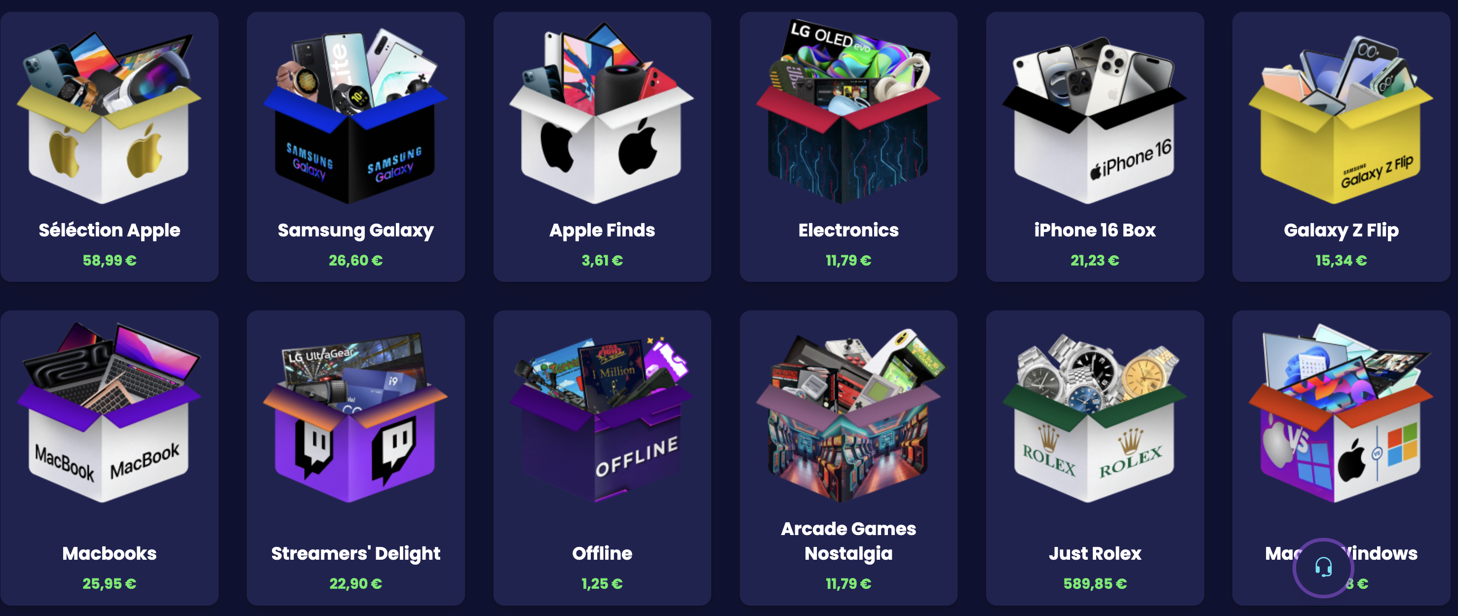 Outre la roue, Jemlit propose également des boîtes mystères à thème. Que vous soyez fan de technologie, de mode, ou de jeux, il y a une boîte pour vous. Pour vous guider, vous pouvez utiliser la barre de recherche et taper directement le mot clé qui vous intéresse. Et n’hésitez à recherchez des choses précises car Jemlit pourrait sérieusement vous surprendre ! Chaque boîte contient des cadeaux surprises, et certaines offrent même la possibilité de gagner des iPhones ou d’autres smartphones haut de gamme.