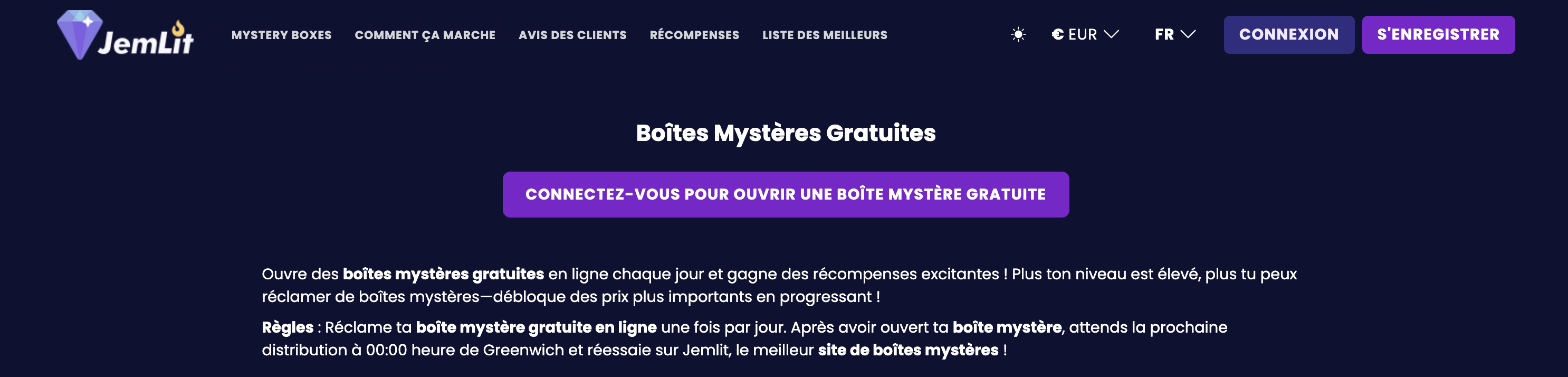 Sur Jemlit.com, vous avez la possibilité de tourner la roue une fois par jour gratuitement grâce aux boîtes mystères gratuites disponibles sur le site. C’est l’occasion idéale de tenter votre chance quotidiennement pour remporter un iPhone ou d’autres cadeaux de grande valeur, sans dépenser un centime. Et ce n’est pas tout : lors de votre inscription, une offre de bienvenue exclusive vous attend avec 3 boîtes mystères gratuites à ouvrir immédiatement, ainsi qu’un bonus de 100 % sur votre premier dépôt.