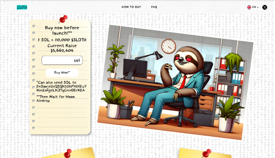 1 SOL equates to 10,000 $SLOTH at presale but may get you far less once it launches on exchanges.