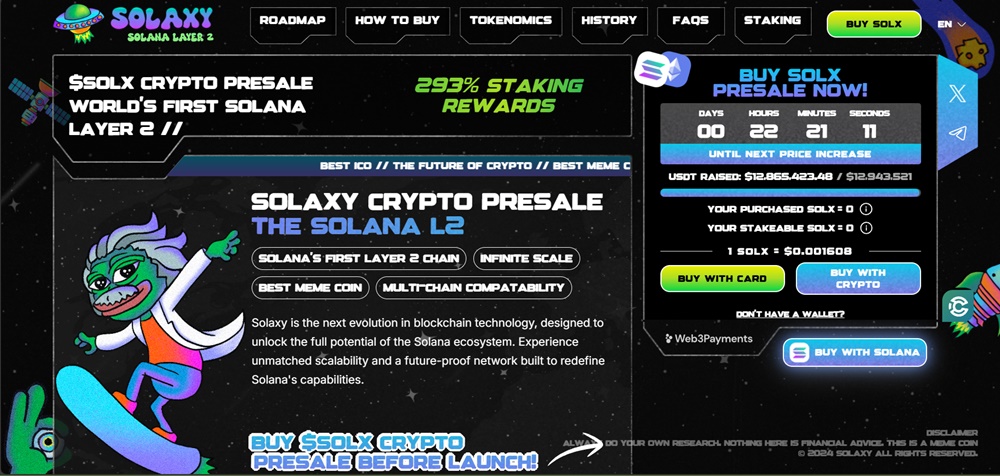 Solaxy funkcioniše na Solana mreži i prvi je token na Layer 2 blockchainu. Pretprodaja je do sada prikupila skoro 25 miliona dolara. Trenutna cena svakog $SOLX iznosi 0.001654 dolara, a očekuje se da će sledeća pretprodaja povećati cenu.