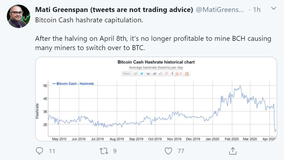 Just two days after the Bitcoin Cash halving, mining it was no longer profitable as miners capitulated to mine Bitcoin instead: