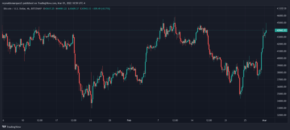 As of press time, Bitcoin (BTC) trades at $43,984 with an 11.6% profit in the last 24-hours.